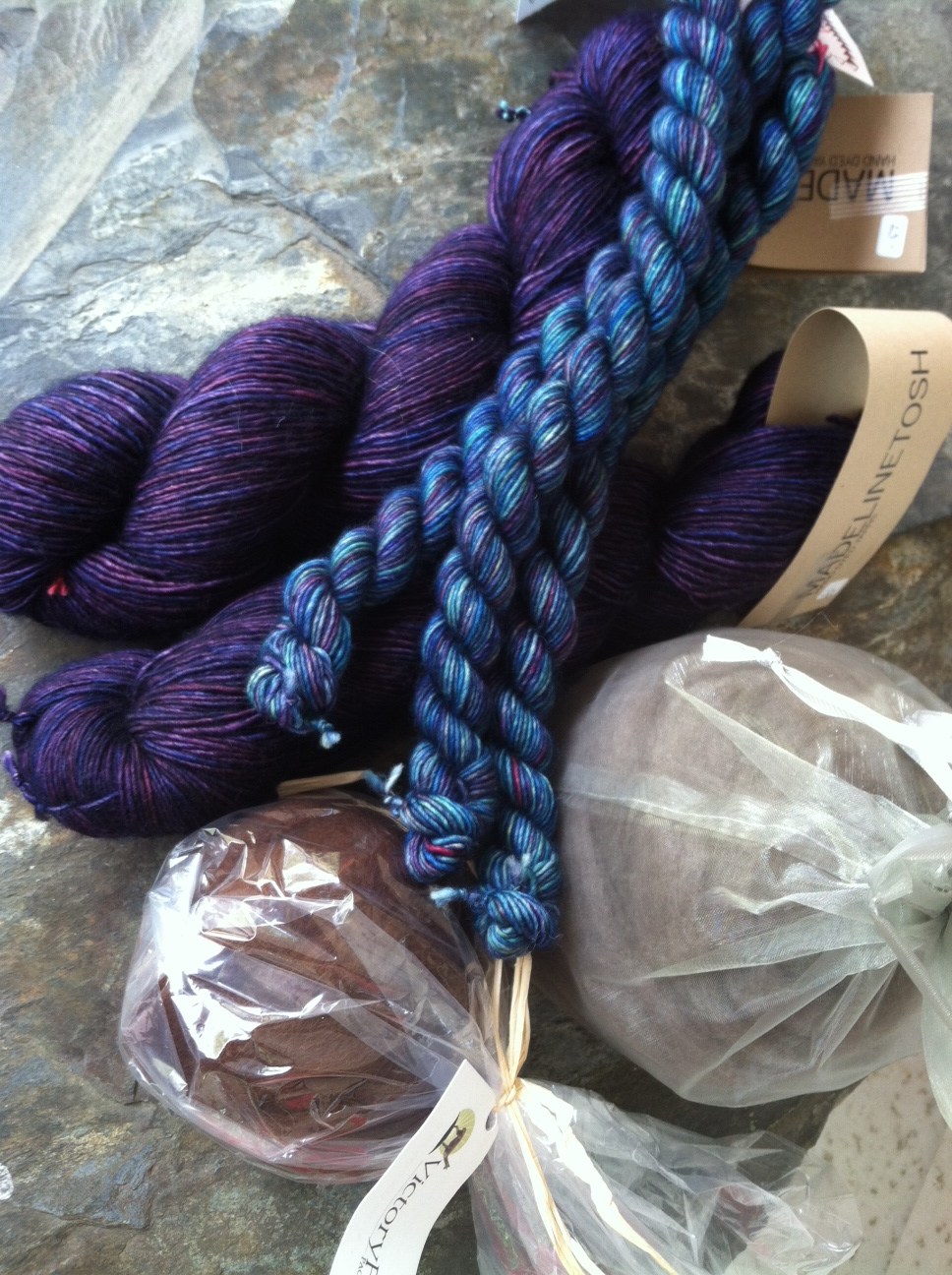 Just returned from the Rhinebeck Sheep and Wool Festival! More about that soon, but here are a few photos of some of the lovelies that came home with me–yarns, fleece, and beautifully painted roving! Aren’t they yummy?